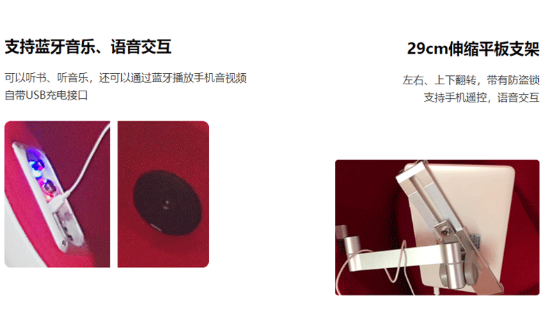 產品特點:浩田視聽休閑太空艙可以閱讀數字書報刊,也可以聽書、聽音樂,也可以看視頻課件等,還可以通過藍牙播放手機音視頻。讓讀者在這又酷又炫的太空艙體驗感知新科技、新數字、藝術化的數字體驗空間。