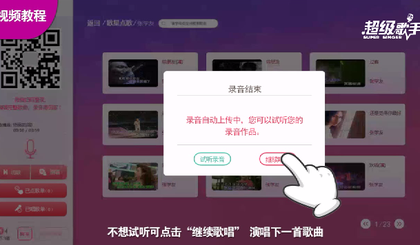 4錄音只有一次機(jī)會,當(dāng)你演唱完后,歌曲自動上傳服務(wù)器上,當(dāng)中,你可以試聽錄音效果,也可以點擊繼續(xù)唱歌。