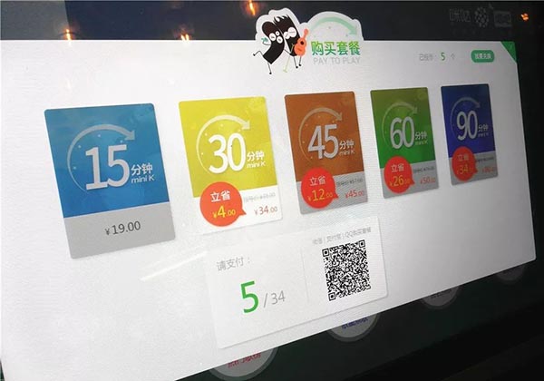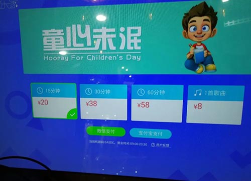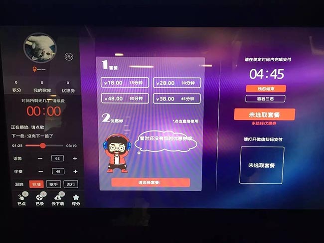 迷你自助ktv唱吧怎么收費(fèi)?多少錢一小時(shí)?掃描二維碼登錄后發(fā)現(xiàn),每臺機(jī)器每天有著限定的免費(fèi)試唱名額,名額用完后,只能試唱更短的時(shí)間,如果還想繼續(xù)唱歌就要充值。屏幕上顯示,一首歌曲付費(fèi)5元,包時(shí)15分鐘20元,一小時(shí)64元。